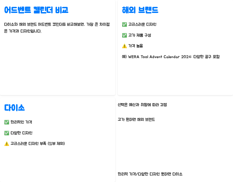 예를 들어, WERA Tool Advent Calendar 2024는 다양한 공구가 들어있어, 공구 애호가들에게 인기가 많지만 가격이 다소 높습니다. 반면, 다이소 어드벤트 캘린더는 합리적인 가격으로 다양한 디자인을 제공하여, 폭넓은 소비자층을 사로잡고 있습니다.