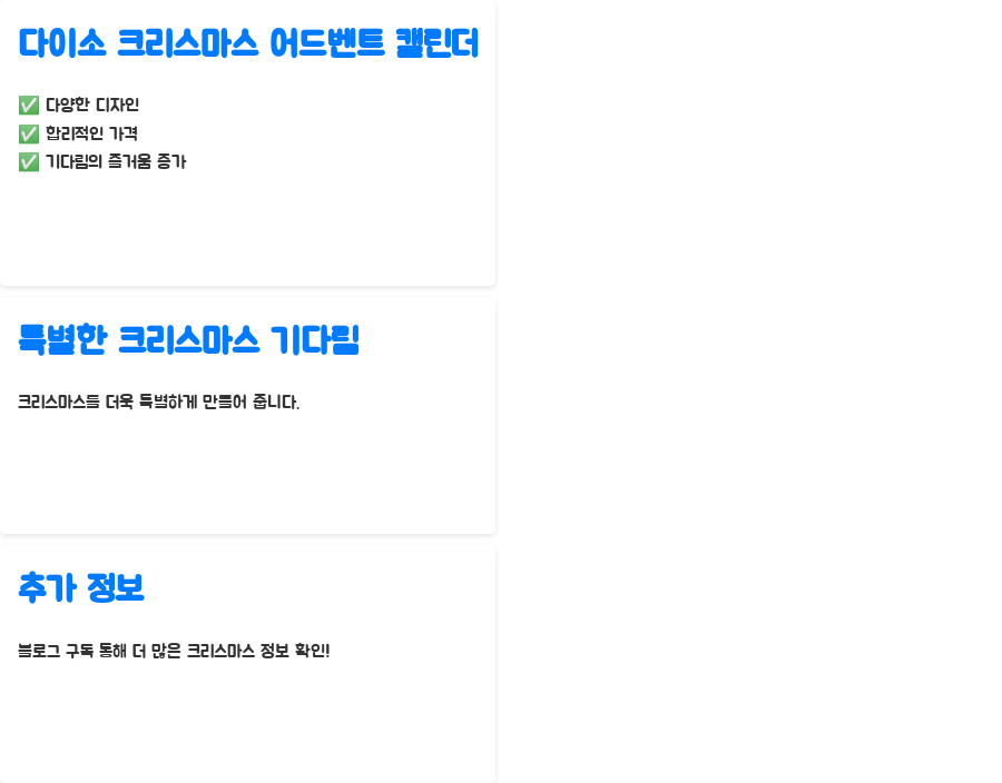 오늘 알아본 다이소 크리스마스 어드벤트 캘린더, 어떠셨나요? 다양한 디자인과 합리적인 가격, 그리고 즐거움까지 더해진 다이소의 어드벤트 캘린더는 크리스마스를 기다리는 시간을 더욱 특별하게 만들어 줄 것입니다.