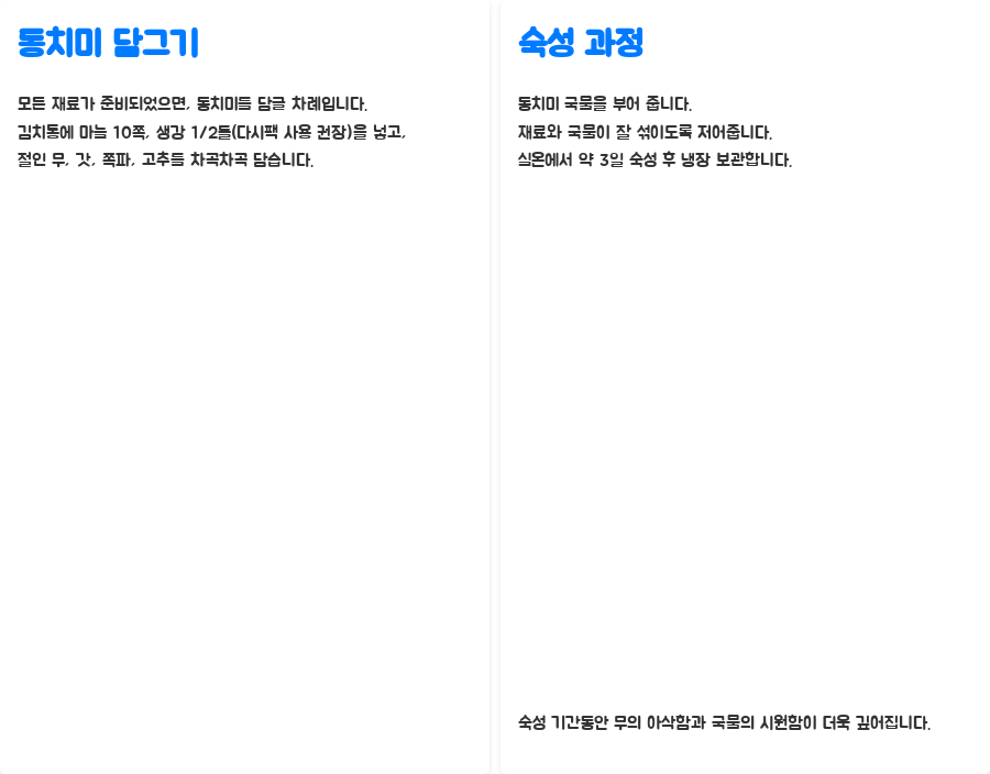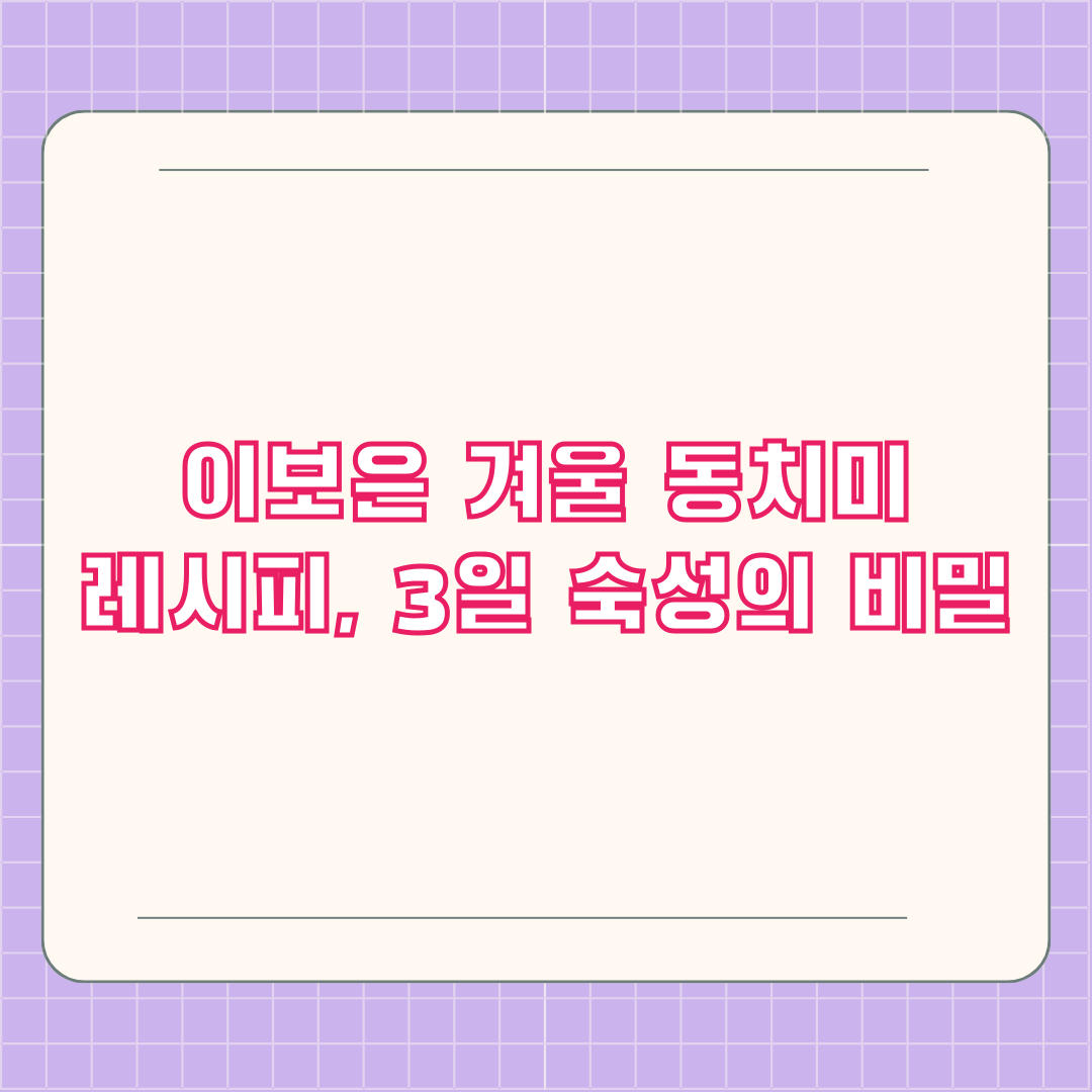| 담그고 숙성 | 모든 재료 | 김치통에 재료 담기, 동치미 국물 부어 숙성 | 3일간 실온 숙성 후 냉장 보관 |
