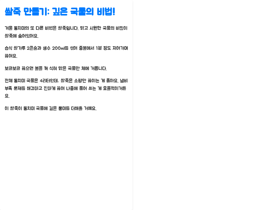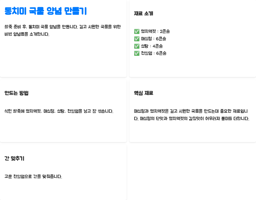 | 동치미 국물 | 쌀죽, 멸치액젓, 매실청, 설탕, 소금 | 동치미 국물 양념 만들기 | 고운 천일염 사용 |