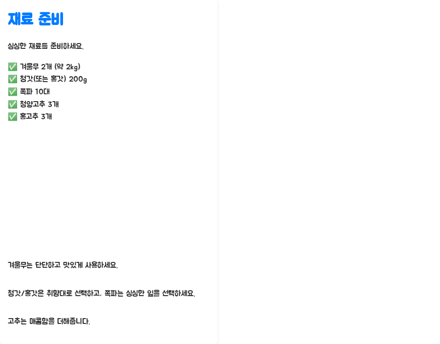 | 재료 준비 | 겨울무, 청갓(홍갓), 쪽파, 고추 | 신선한 재료 선택 | 겨울무 사용 |