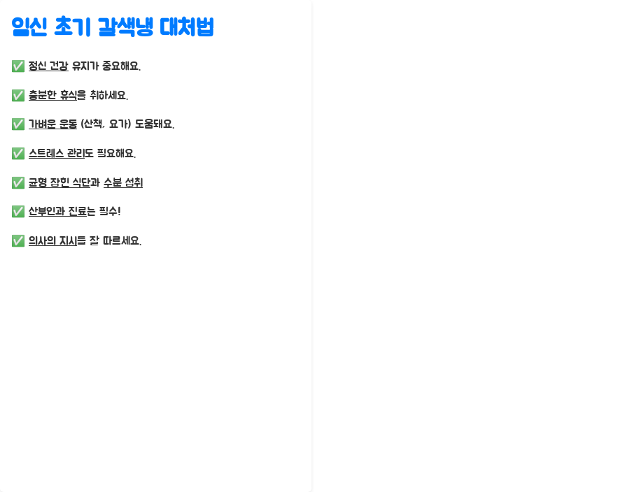 오늘 알아본 내용 어떠셨나요? 임신 초기 갈색냉은 흔한 증상일 수 있지만, 안전을 위해 항상 주의해야 합니다.