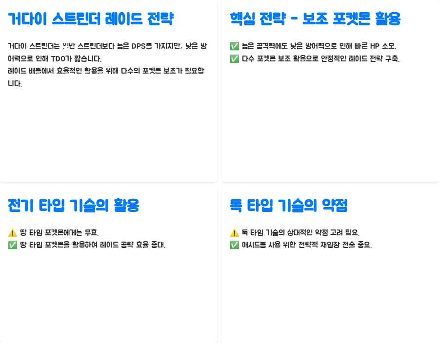 따라서 레이드 배틀에서는 다수의 포켓몬을 활용하여 스트린더를 보조하는 전략이 효과적입니다. 특히, 거다이 스트린더의 전기 타입 기술은 땅 타입 포켓몬에게 무효이므로, 땅 타입 포켓몬을 활용하여 레이드를 공략하는 것이 효율적입니다.