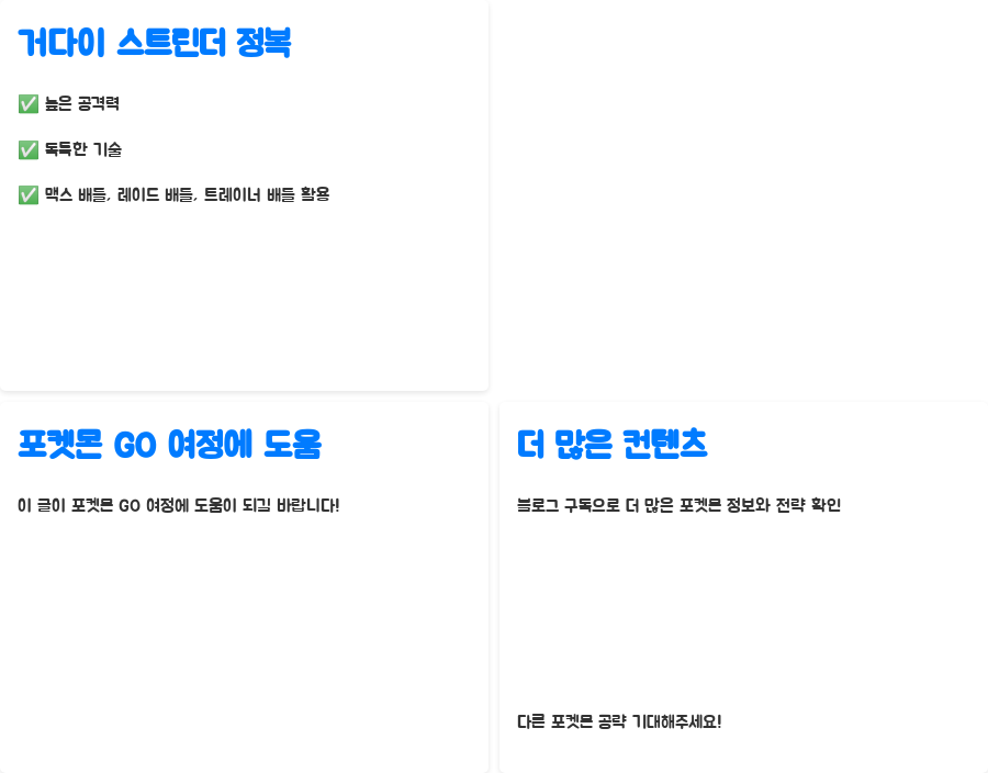 오늘은 포켓몬 GO의 새로운 강자, 거다이맥스 스트린더에 대해 자세히 알아봤습니다. 높은 공격력과 독특한 기술들을 가진 거다이 스트린더를 효과적으로 활용하여, 맥스 배틀과 레이드 배틀, 트레이너 배틀에서 승리의 쾌감을 만끽해보세요!
