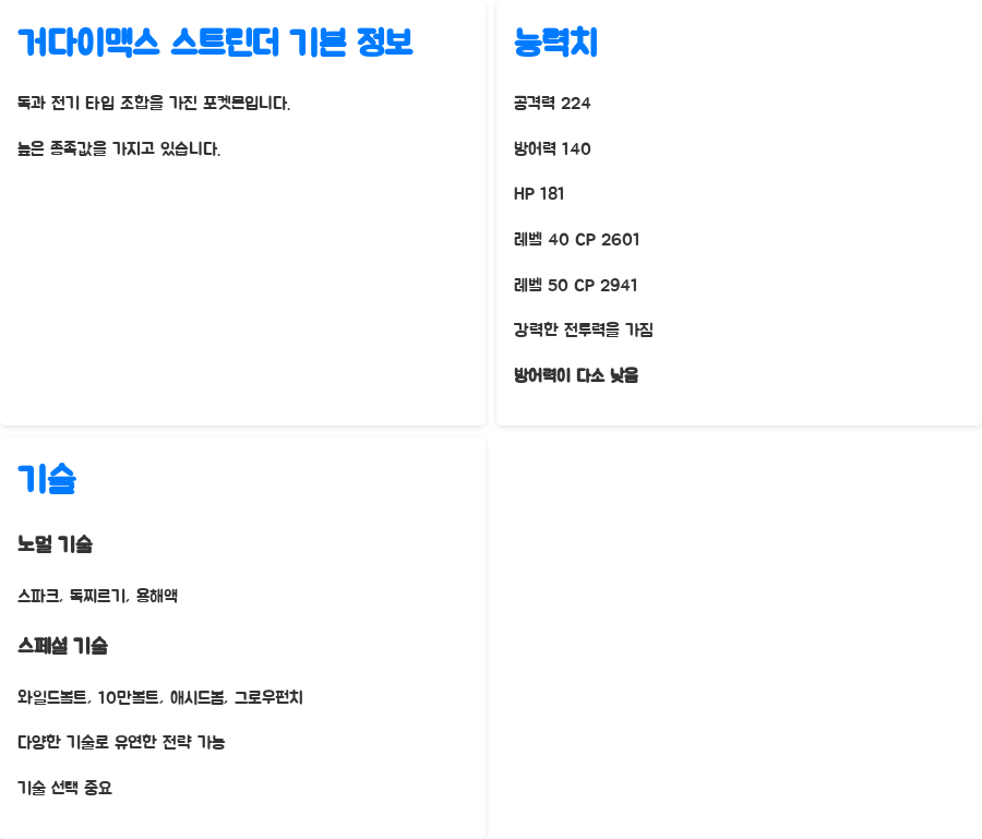 먼저 거다이맥스 스트린더의 기본 정보부터 살펴보겠습니다. 독과 전기라는 이색적인 타입 조합을 가진 이 포켓몬은 종족값 또한 상당히 매력적입니다.