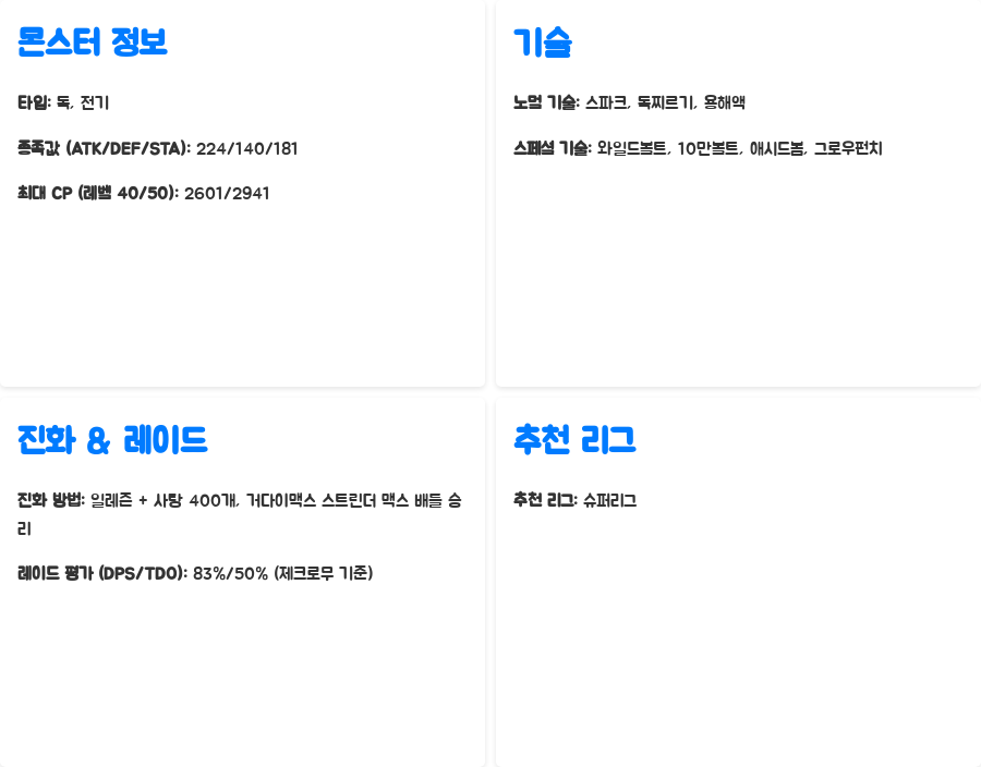 하지만 방어력이 다소 낮다는 점은 주의해야 할 부분입니다. 노멀 기술로는 스파크, 독찌르기, 용해액을, 스페셜 기술로는 와일드볼트, 10만볼트, 애시드봄, 그로우펀치를 사용합니다.