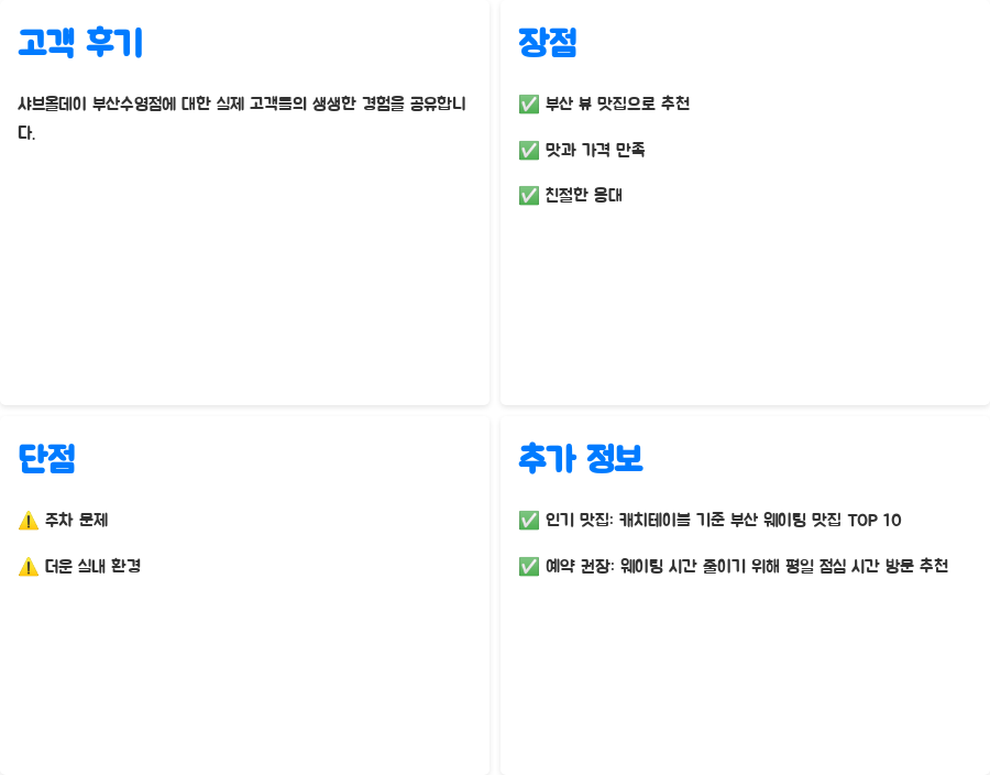 | 단점 | 레스토랑 음식 품질, 혼잡함 |