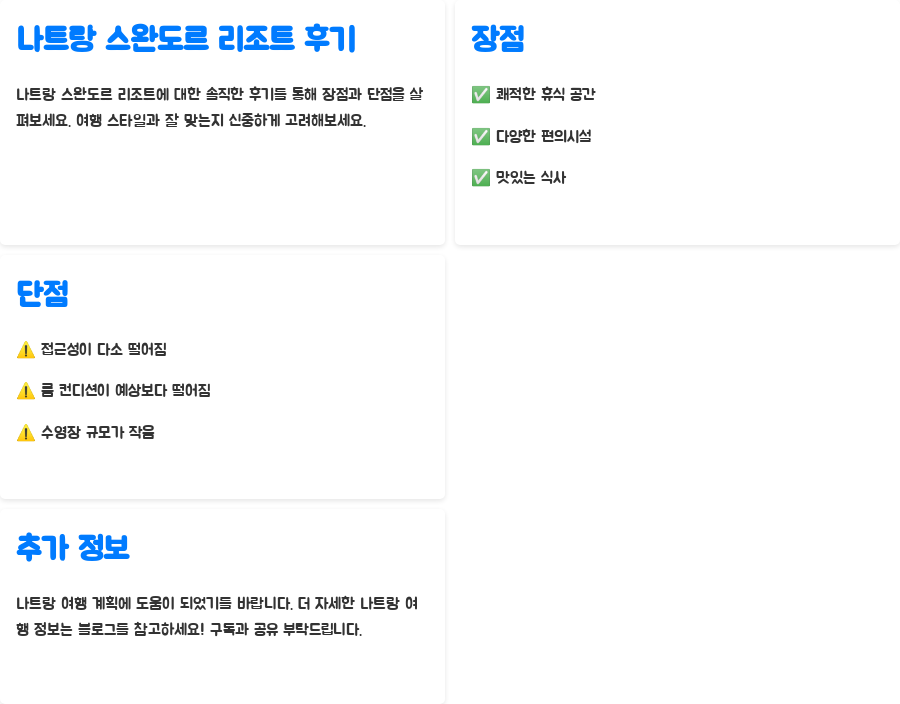 오늘 나트랑 스완도르 리조트에 대한 솔직한 후기를 통해 어떠셨나요? 장점과 단점을 잘 비교해보고, 자신에게 맞는 여행 스타일인지 신중하게 판단해보세요.