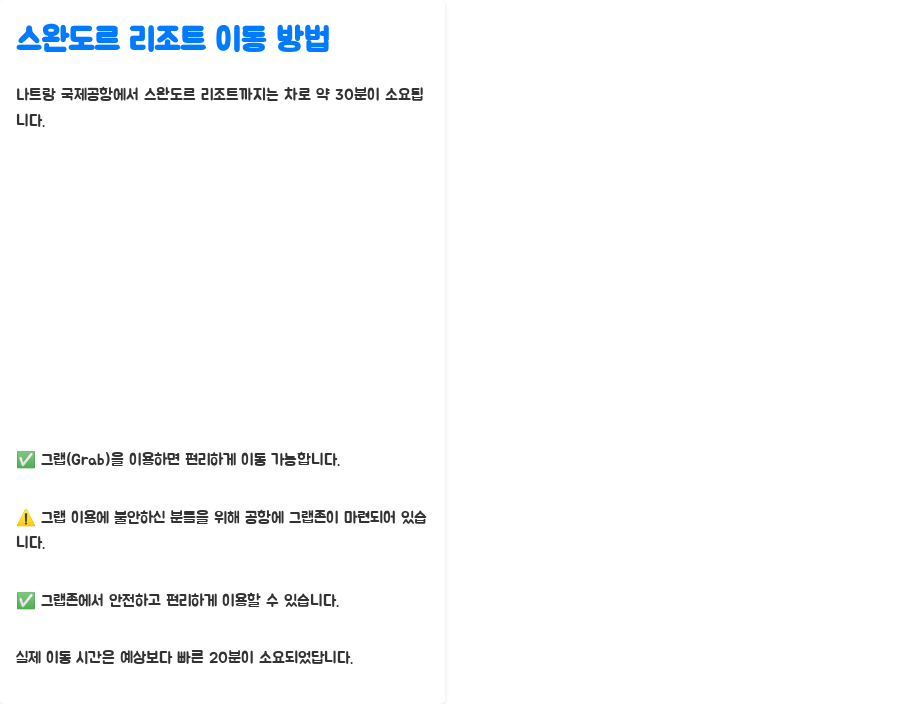 | 교통 | 나트랑 국제공항에서 그랩 이용, 약 30분 거리 |