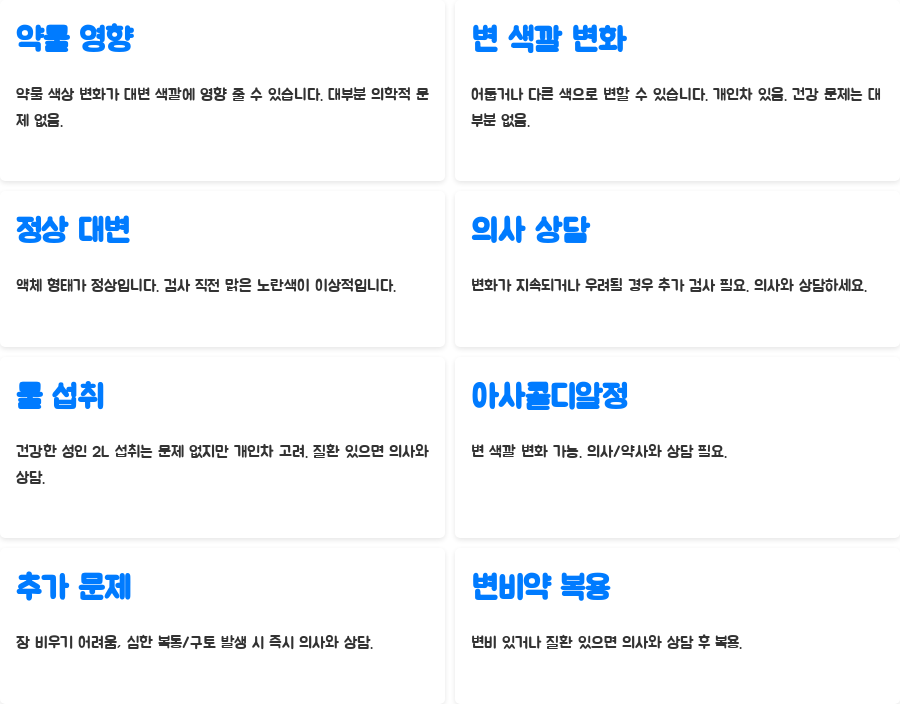 | 약물의 영향 | 약물 색상이 변 색깔에 영향을 줄 수 있음, 대부분 의학적으로 문제 없음 |