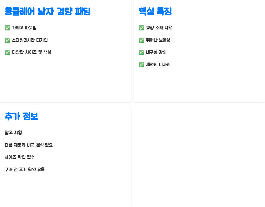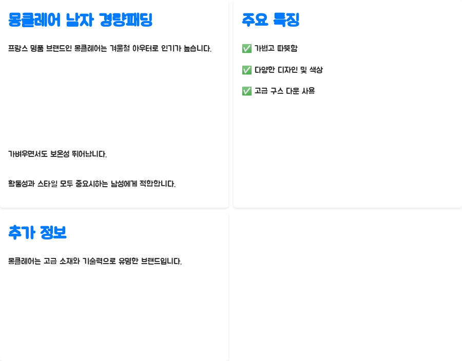이번 포스팅에서는 몽클레어 남자 경량 패딩의 인기 모델과 가격, 특징을 자세히 알아보고 구매 팁까지 공유합니다. 여러분의 겨울철 스타일링을 완성하는 데 도움을 드리겠습니다. 준비되셨나요? 따뜻하고 스타일리시한 겨울을 위한 여정을 시작해 볼까요?