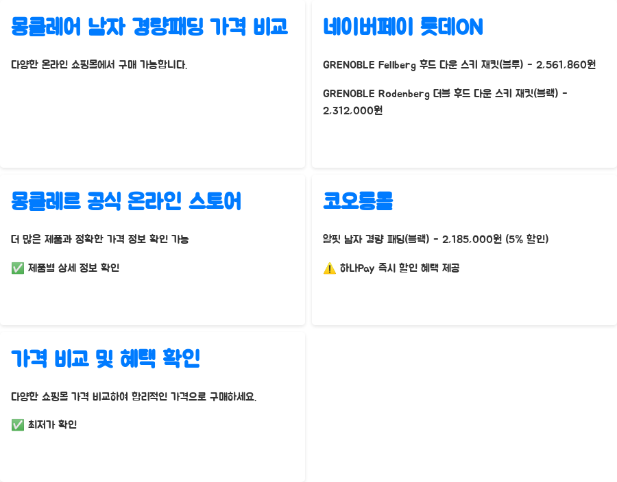 몽클레어 남자 경량패딩은 다양한 온라인 쇼핑몰에서 구매할 수 있습니다. 네이버페이 롯데ON에서는 몽클레르 GRENOBLE Fellberg 후드 다운 스키 재킷(블루)를 2,561,860원에 판매합니다. 몽클레르 남성 GRENOBLE Rodenberg 더블 후드 다운 스키 재킷(블랙)을 2,312,000원에 판매하고 있습니다. 몽클레르 공식 온라인 스토어에서는 더 많은 제품과 정확한 가격 정보를 확인할 수 있습니다. 코오롱몰에서는 몽클레어 알핏 남자 경량 패딩(블랙)을 5% 할인된 2,185,000원에 판매하고 있으며, 하나Pay 즉시 할인과 같은 추가 혜택도 제공합니다. 다양한 쇼핑몰의 가격과 혜택을 비교하여 가장 합리적인 가격으로 구매하세요.