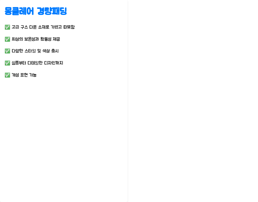 Q3. 몽클레어 경량패딩은 어떤 스타일에 어울리나요? A. 캐주얼부터 포멀까지 다양한 스타일에 매치할 수 있습니다. 심플한 디자인은 어떤 옷에도 잘 어울립니다.