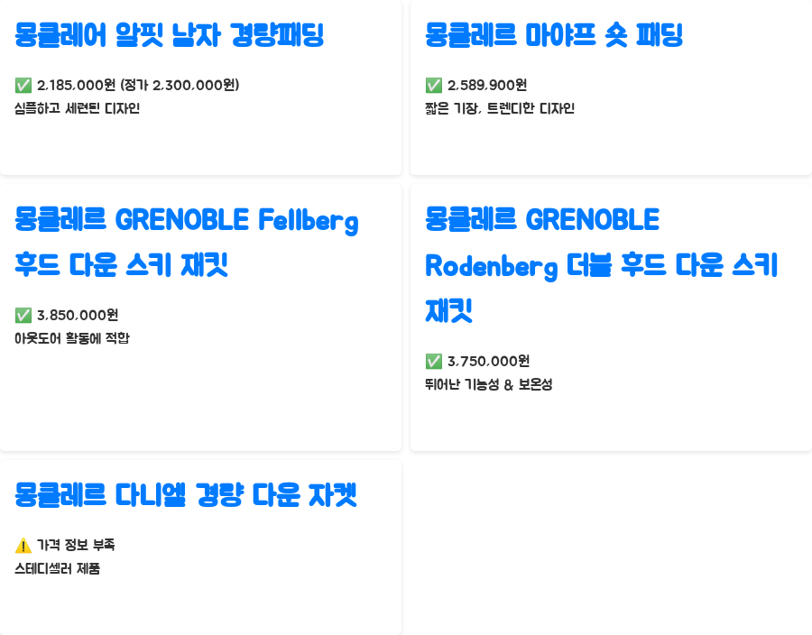 몽클레어 알핏 남자 경량패딩(블랙)은 2,185,000원(정가 2,300,000원)에 구매할 수 있으며, 심플하고 세련된 디자인이 특징입니다. 몽클레르 마야프 숏 패딩 다운 재킷은 2,589,900원으로, 짧은 기장과 트렌디한 디자인으로 젊은 층에게 인기가 많습니다. 스키와 같은 아웃도어 활동에 적합한 몽클레르 GRENOBLE Fellberg 후드 다운 스키 재킷은 3,850,000원입니다. 몽클레르 GRENOBLE Rodenberg 더블 후드 다운 스키 재킷은 3,750,000원에 판매되고 있습니다. 뛰어난 기능성과 보온성을 갖춘 고가 라인입니다. 몽클레르 다니엘 경량 다운 자켓은 가격 정보가 부족하지만, 많은 분들이 찾는 스테디셀러 제품입니다. 이 외에도 다양한 모델이 있으니, 취향과 예산에 맞는 제품을 찾아보세요.