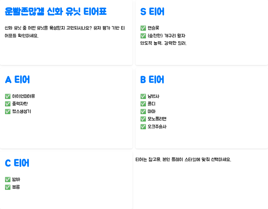 운빨존많겜의 핵심은 바로 신화 유닛입니다. 하지만 수많은 신화 유닛 중 어떤 유닛을 육성해야 할까요? 다음은 유저들이 평가한 신화 유닛 티어표입니다.