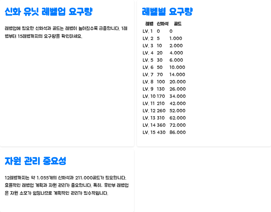 레벨업에 필요한 신화석과 골드의 양은 레벨이 올라갈수록 기하급수적으로 증가합니다. 1레벨부터 15레벨까지의 요구량은 다음과 같습니다.
