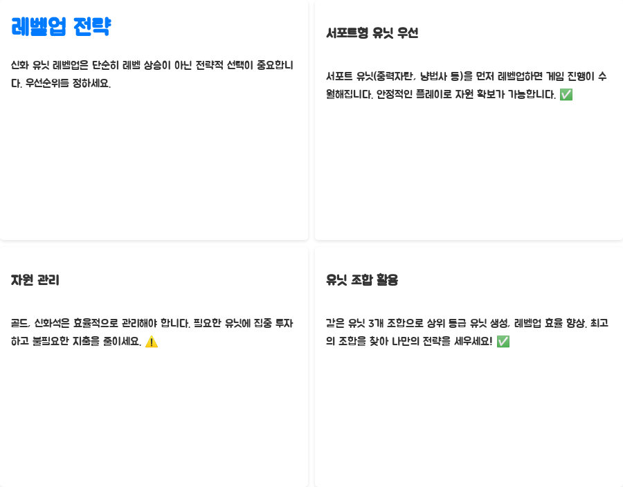 중력자탄이나 냥법사와 같은 서포트형 유닛을 먼저 레벨업하면 게임 진행이 훨씬 수월해집니다. 안정적인 플레이를 통해 더 많은 자원을 확보할 수 있기 때문입니다.