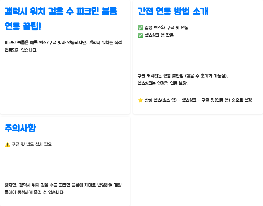 피크민 블룸은 애플 헬스와 구글 핏과 연동되어 걸음 수를 측정합니다. 하지만 안타깝게도, 갤럭시 워치는 직접적으로 연동되지 않습니다. 하지만 걱정 마세요! 저 세미콜론이 직접 해결책을 찾았으니까요! 갤럭시 워치 사용자라면 삼성 헬스와 구글 핏을 연동하여 간접적으로 걸음 수를 피크민 블룸에 반영할 수 있습니다.