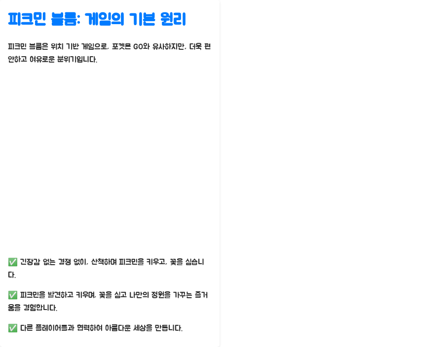 피크민 블룸은 포켓몬 GO와 비슷한 위치 기반 게임이지만, 훨씬 더 여유롭고 느긋하게 즐길 수 있습니다. 포켓몬 GO처럼 긴장감 넘치는 경쟁 요소는 없고, 산책하며 피크민을 키우고 꽃을 심는 편안한 게임성을 가지고 있습니다.