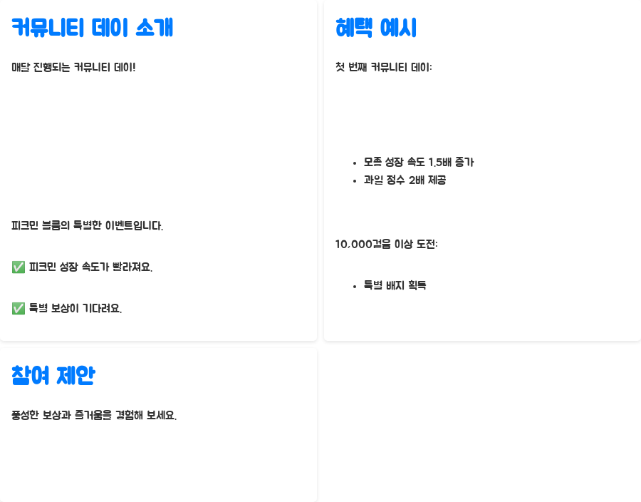 | 커뮤니티 이벤트 | 매달 커뮤니티 데이 개최 (특별 보상 및 이벤트 제공) |