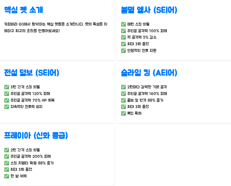 먼저, 카피바라 GO에서 맹활약 중인 핵심 펫들을 자세히 살펴보겠습니다. 각 펫의 특성을 제대로 이해해야 최고의 조합을 만들 수 있으니까요!