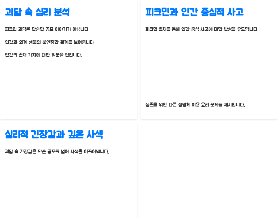 A3. 피크민 괴담은 단순한 공포 이야기를 넘어, 인간과 외계 생명체의 공존에 대한 질문과 생존에 대한 윤리적인 고민을 던지는 심오한 의미를 지니고 있습니다.