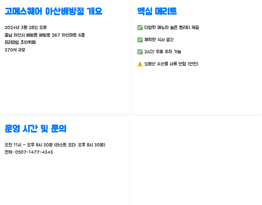 고메스퀘어 아산배방점은 2024년 3월 28일, 충남 아산시 배방읍 배방로 267 아산마트 6층에 문을 연 프리미엄 초밥뷔페입니다.