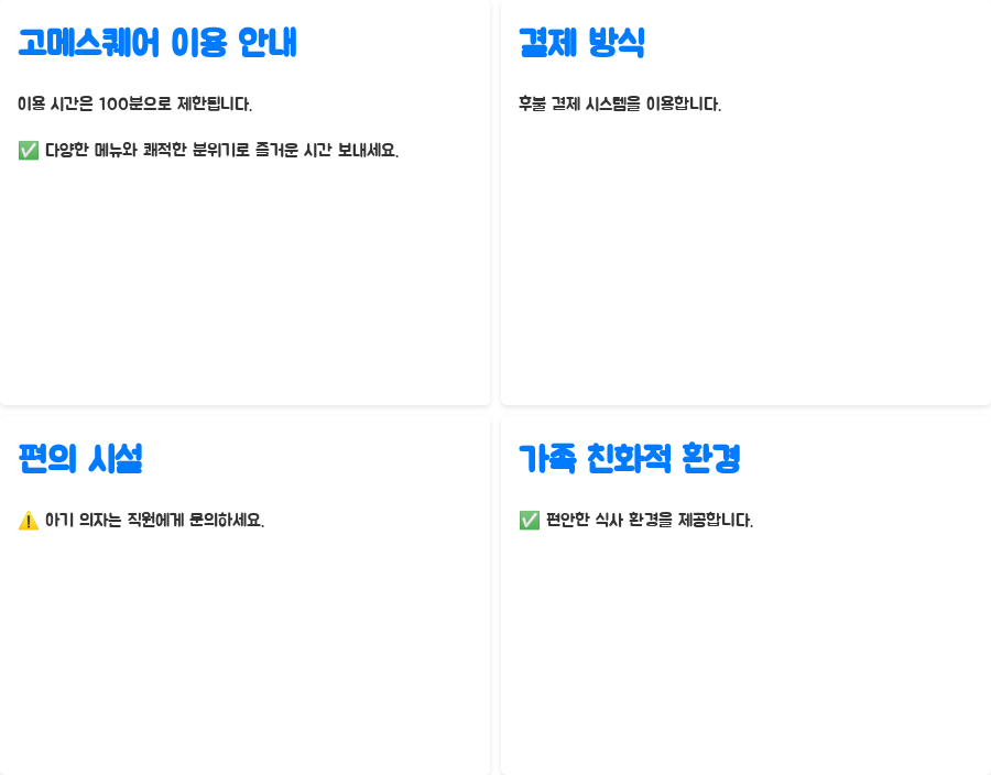 가족 친화적인 시스템으로 편안한 식사를 즐길 수 있다는 점도 큰 장점입니다.