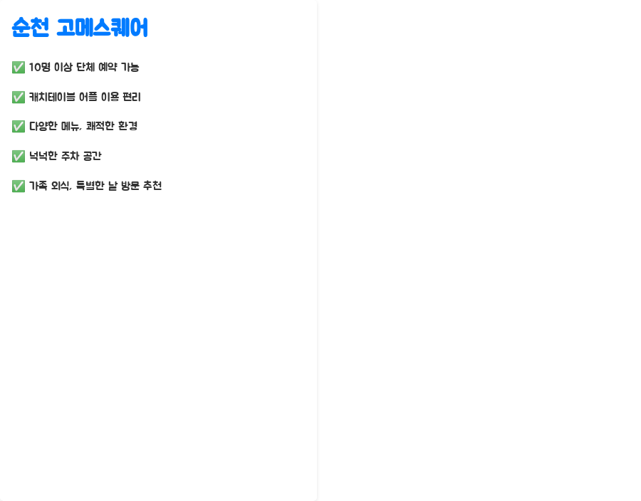 오늘은 순천 고메스퀘어의 예약 방법부터 가격, 주차 정보, 이용 시간까지 자세히 알아보았습니다.