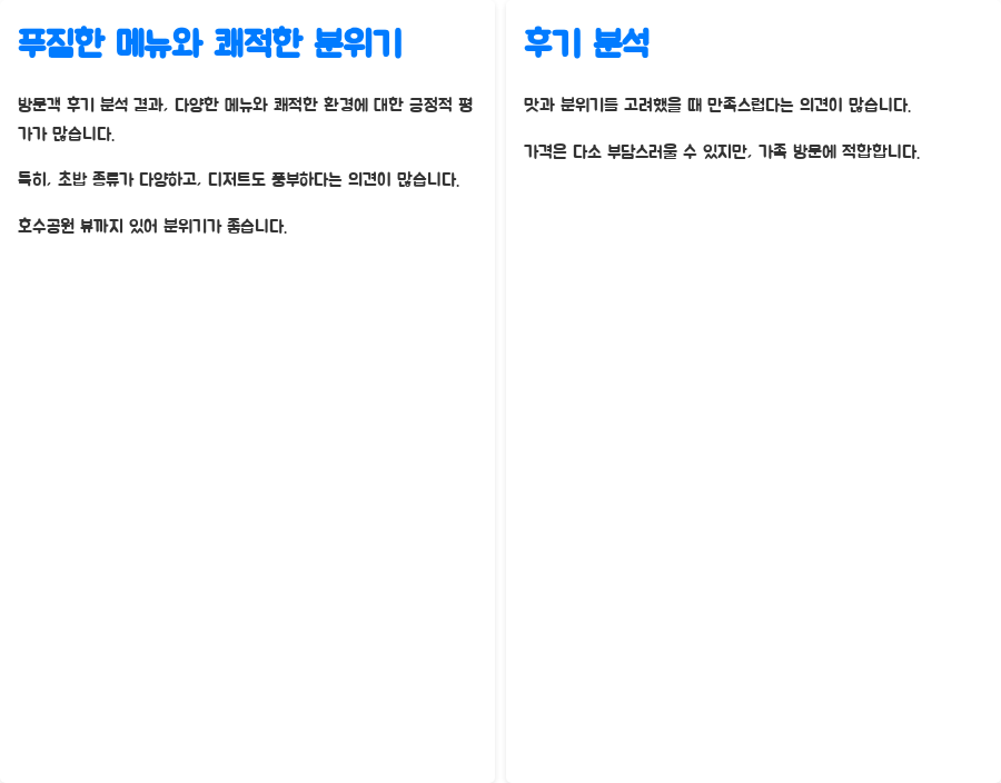 실제 방문객들의 후기를 살펴보면 다양한 메뉴와 쾌적한 환경에 대한 긍정적인 평가가 많습니다.