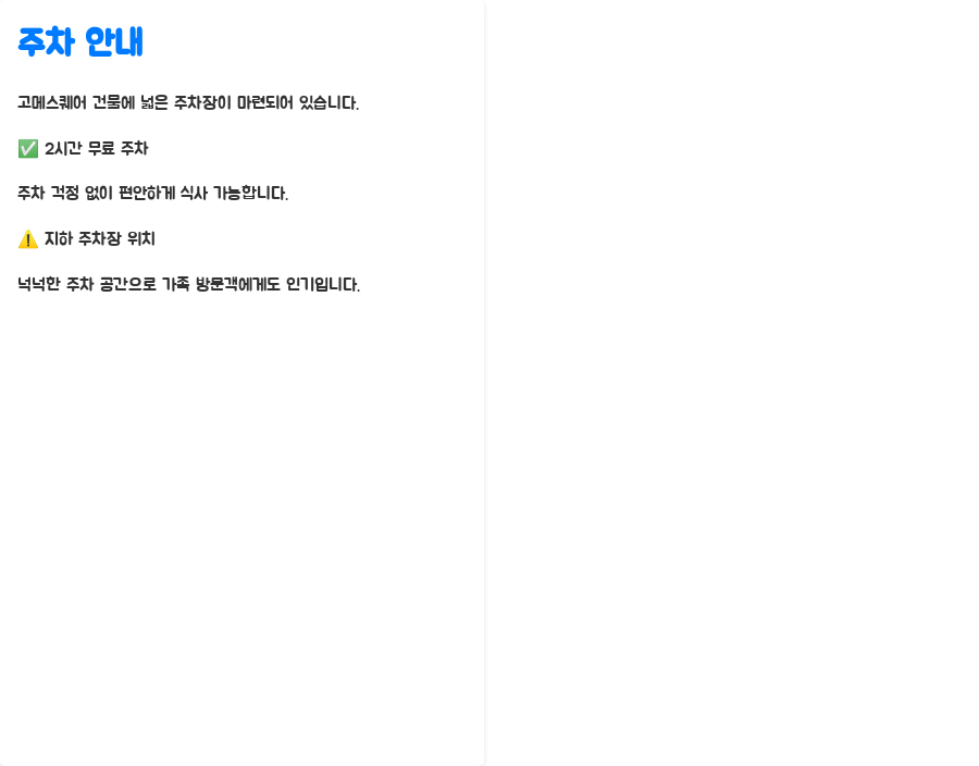 고메스퀘어 건물에는 넓은 주차장이 마련되어 있습니다. 2시간 무료 주차를 지원하니, 주차 걱정 없이 편안하게 식사를 즐길 수 있습니다.