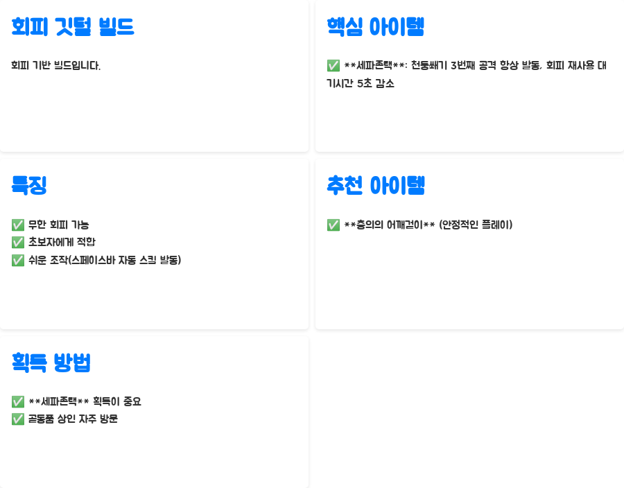 회피 깃털 빌드는 말 그대로 회피를 기반으로 한 빌드입니다. 세파존택이라는 고유 유니크 아이템이 핵심이며, 이 아이템을 착용하면 기본 기술인 천둥쐐기의 3번째 공격이 항상 발동되어 회피 재사용 대기시간이 5초나 감소합니다. 결과적으로 무한 회피가 가능해지는 것이죠. 마치 닌자처럼 재빠르게 적들을 피해 다니며 전투를 펼칠 수 있습니다. 게임 초반부터 고행 3단계까지도 무난하게 진행 가능하며, 세팅 난이도가 낮아 초보자에게 매우 적합합니다. 충의의 어깨걸이와 같은 아이템을 추가로 장착하면 더욱 안정적인 플레이가 가능해집니다. 스페이스바만 눌러도 자동으로 스킬이 발동되니, 손쉽게 즐길 수 있다는 점도 큰 장점입니다. 특히, 세파존택 획득이 핵심이므로 골동품 상인을 자주 찾아보는 것이 좋습니다.