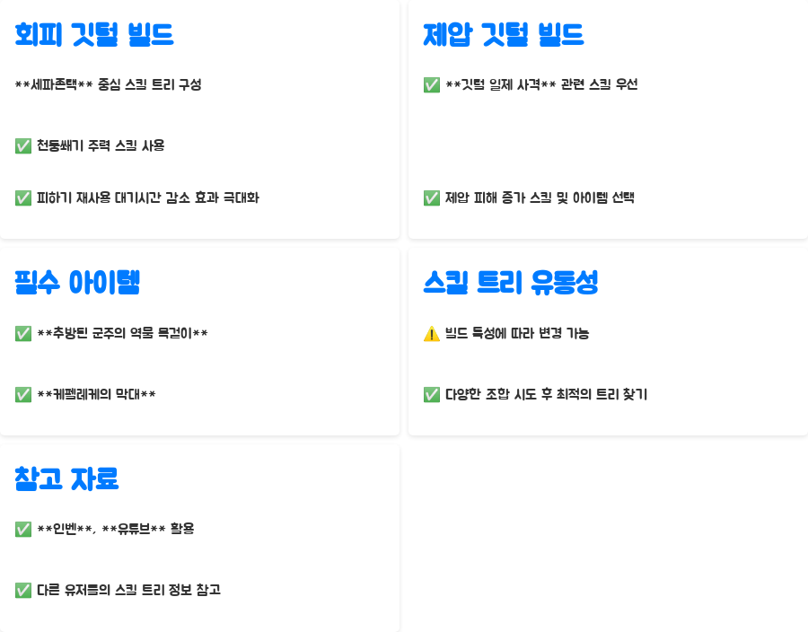 회피 깃털 빌드는 세파존택을 중심으로 스킬 트리를 구성하는 것이 좋습니다. 천둥쐐기를 주력 스킬로 사용하며, 피하기 재사용 대기시간 감소 효과를 극대화하는데 집중합니다. 제압 깃털 빌드는 깃털 일제 사격에 필요한 스킬들을 우선적으로 찍고, 제압 피해를 증가시키는 스킬과 아이템을 선택하는 것이 좋습니다. 추방된 군주의 역물 목걸이와 케펠레케의 막대는 필수 아이템이라고 할 수 있습니다. 하지만 각 빌드의 특성에 따라 스킬 트리는 유동적으로 변경될 수 있으므로, 다양한 스킬 조합을 시도해 보면서 자신에게 최적의 트리를 찾는 것이 중요합니다. 인벤이나 유튜브를 통해 다른 유저들의 스킬 트리 정보를 참고하는 것도 좋은 방법입니다.
